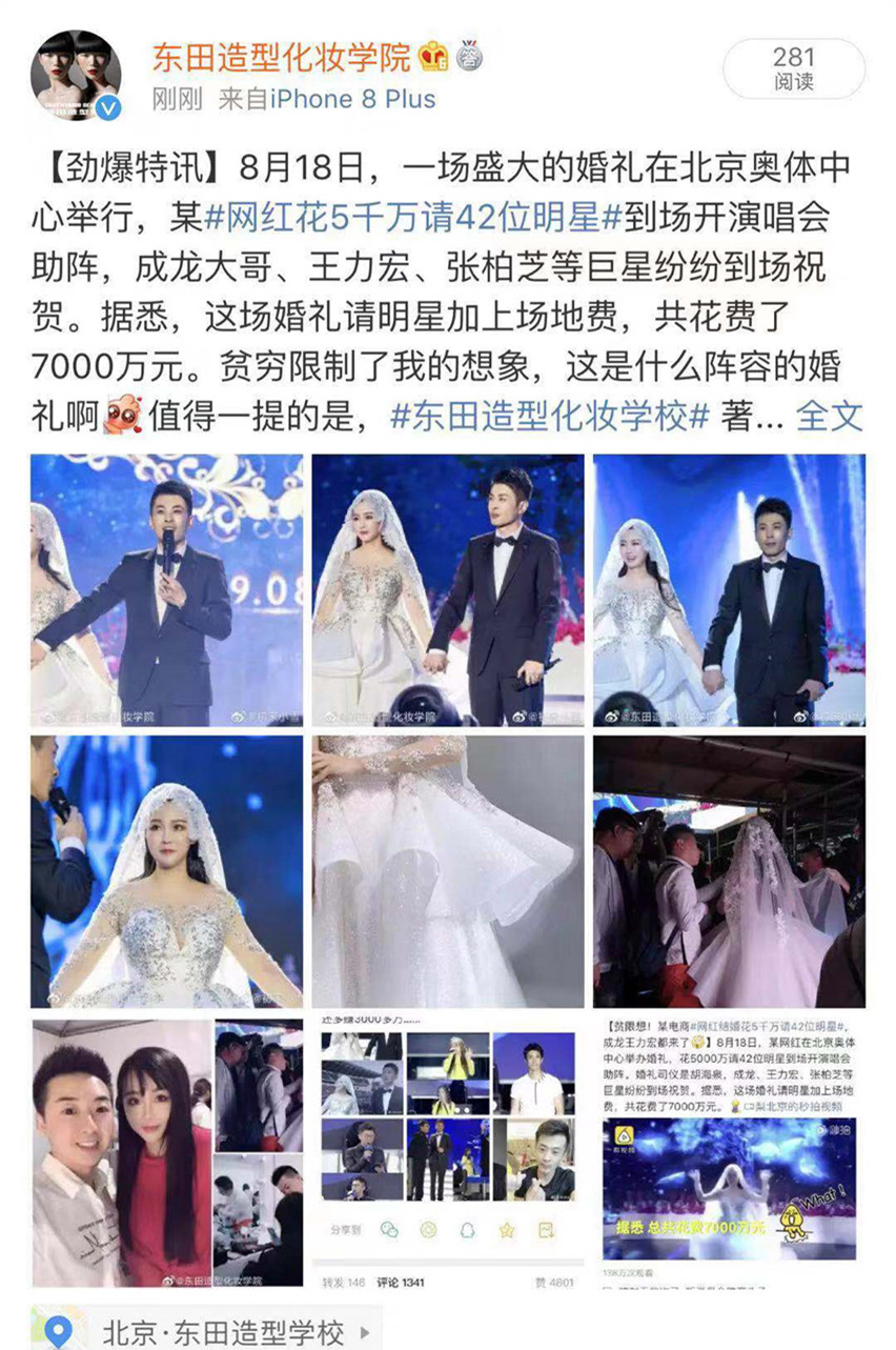 【校网讯】8月18日,一场盛大的婚礼在北京奥体中心举行,某网红重金出掷5千万,邀请42位明星到场开办演唱会助阵,其中包括成龙大哥、王力宏、张柏芝等巨星,都纷纷到场祝贺!一众媒体对此次盛况进行了报道!