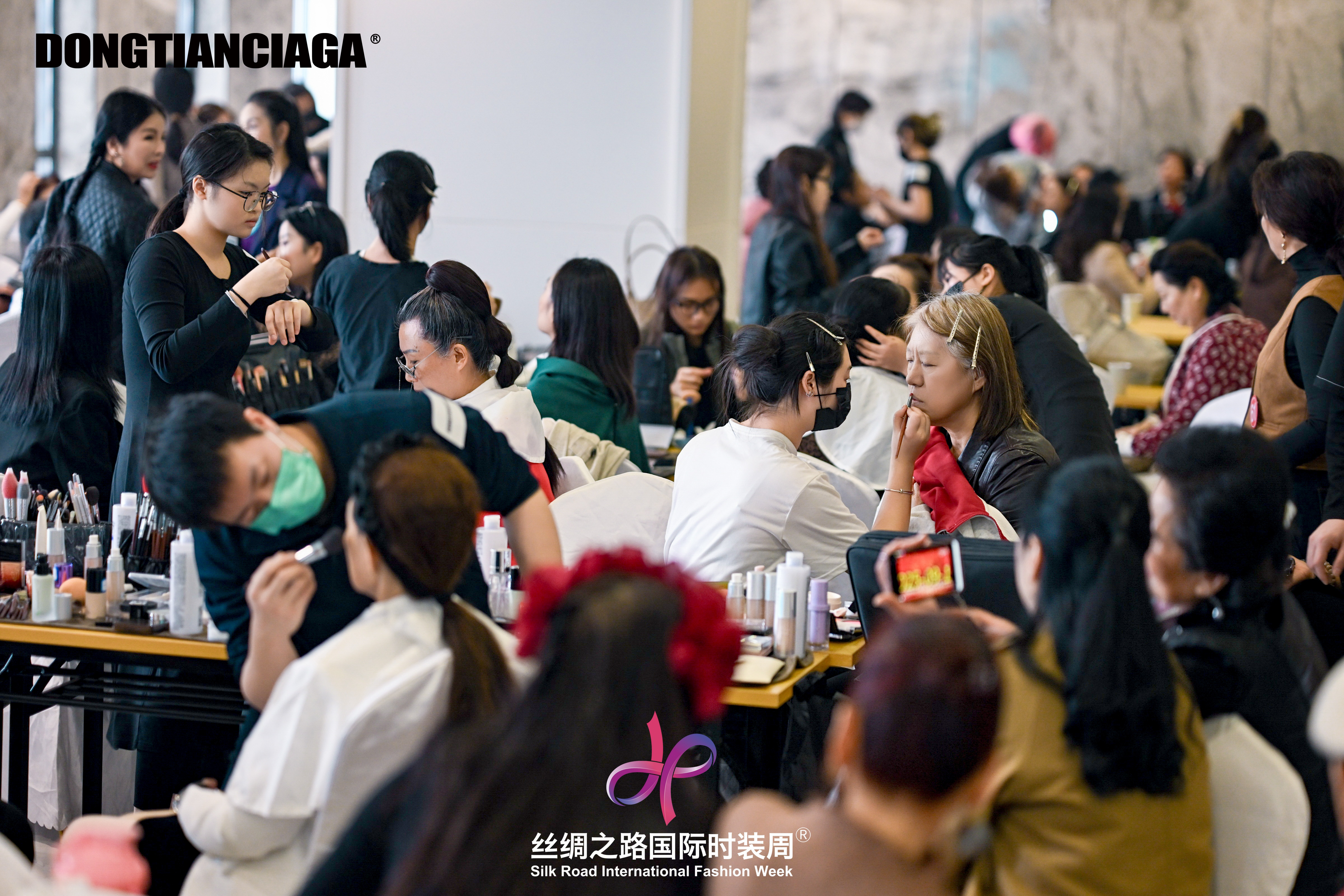 在紧张繁忙的时装周后台,DONGTIANCIAGA化妆团队展现了高度专业化的作业流程与默契配合。面对每场秀之间短暂的换场时间,团队通过事前充分准备与模拟演练,制定了精确到分钟的时间管理方案。在《风来了》跨界大秀后台,团队需要在15分钟内为多位模特完成从东盟风情妆容到现代艺术妆容的快速转换,通过高效的团队协作与标准化的操作流程,最终确保了每位模特准时、完美地登场,体现了团队应对高强度工作环境的卓越组织与执行能力。