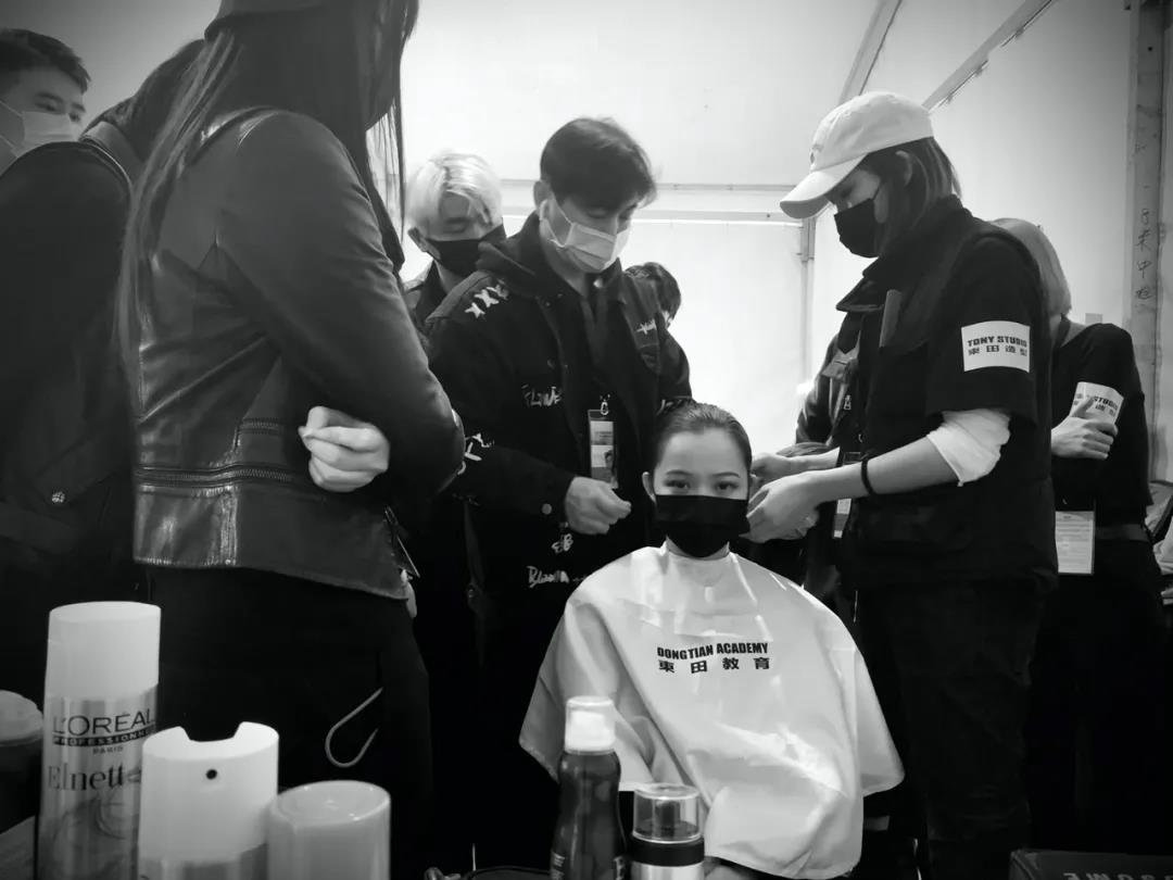 東田之星学校老师金厚权、于婧、王想、朱少卿、郭晶瑾共同带领学生完成了此次OU.大秀的妆发造型工作。