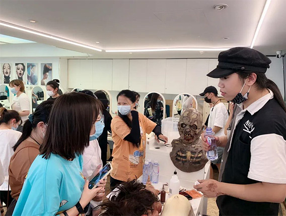 沙龙举行到尾声时,学员们与主讲老师亲密互动,询问各种关于特效化妆的细节,并在欢声笑语中,与现场的“丧尸”合影留念。