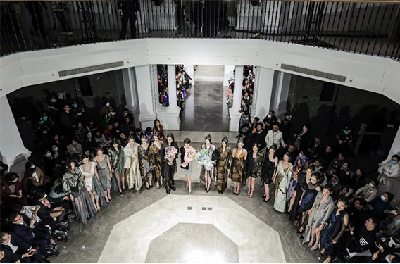 本季服装以低饱和度的中国传统水墨画中的黑白灰色为主色调,并运用了大量不规则的流动线条营造出水墨流动的晕染、侵蚀效果。传承与创新是ZIFEI WANG品牌的创意坚持,本季大秀在开场视频中展现了时下最为热门的“元宇宙秀场”——6套全然不同却栩栩如生的虚拟穿搭以数字科技的方式呈现。“科技+时尚”的基因,让服饰有了更多的创意空间。